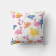 Um padrão tropical vibrante exibindo elegantes flamingos cor-de-rosa cercados por elementos botânicos coloridos como folhas tropicais laranja, amarela e azul, juntamente com delicadas flores cor-de-rosa. Esta design viva evoca um sentido de verão e paraíso tropical.