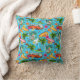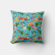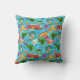 Tropical throw pillow with vintage VW van, surf boards, flowers and palm trees against a blue background.