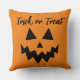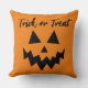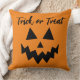 O perfeito travesseiro decorativo de Halloween, com uma face de abóbora de Jack o Lanterna a preto sobre fundo laranja, com as palavras "truque ou trate" no topo.