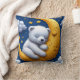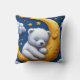 Travesseiro decorativo macio com um urso de pelúcia dormindo enrolado numa lua crescente contra um fundo noturno estrelado, perfeito para decoração de berçário, quartos de bebês, roupa de cama infantil, presentes e cenas de sono aconchegantes.