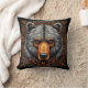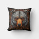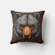Ilustração altamente estilizada da cabeça de um urso, retratada com detalhes intrincados e cores vibrantes. A pelagem do urso é principalmente cinza com toques de laranja ao redor do focinho, dando-lhe uma aparência marcante. Seus olhos são intensos e cativantes, contribuindo para a expressão poderosa do animal. O urso é circundado por uma borda decorativa ornamentada, que adiciona um toque artístico e riqueza à composição. O fundo é preto, o que realça o drama e a profundidade geral da peça, fazendo com que o urso se destaque de forma proeminente. A combinação de cores e desenhos intrincados cria uma obra de arte visualmente atraente que transmite força e majestade.