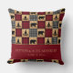 Almofada decorativa rústica com um patchwork de xadrez de búfalo vermelho e preto alternando com remendos de um design de prancha de madeira. Ursos e pinheiros são misturados ao padrão. Personalize com os nomes do casal e a data do casamento, ou qualquer texto que você escolher. Perfeito para a sua casa de montanha.