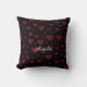 This custom name romantic throw pillow features a pattern of dullish maroon hearts scattered across a deep black background. A stylish and heartfelt accent for any room. Customize the pillow to create a thoughtful Valentine’s Day or anniversary present for someone special.