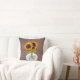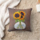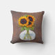 Vase de três lindos girassóis em um travesseiro rústico marrom.