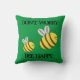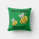 Não se preocupe. Bee feliz. Este trocadilho é escrito em letras de estilo angustiado num brilhante travesseiro decorativo quadrado verde, e decorado com dois desenhos animados, muito bonitinhos, abelhas-bebês. As abelhas são principalmente amarelas brilhantes e o texto é preto. O design está em ambos os lados do travesseiro/almofada.