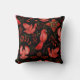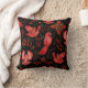 Vibrant red birds with detailed patterns are set against a black background, surrounded by intricate floral and leafy designs, creating a lively, ornamental scene.