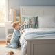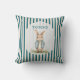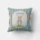 Add a delightful touch of storybook nostalgia to your child's room with this unique throw pillow. It features a charming watercolor illustration of a little bunny wearing a blue jacket, with the name of choice delicately printed above. The design is framed by a soft watercolor wash and set against a backdrop of classic blue and cream vertical stripes, creating a timeless and endearing look. This pillow is perfect for creating a cozy and whimsical atmosphere in a nursery or children's bedroom, bringing a beloved character to life.