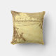 Um travesseiro decorativo com a vindima de uma praia tropical com palmeiras, nuvens fofinhas e oceano no horizonte em marrom rústico sobre um fundo falso de pergaminho.