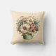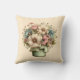 Pillow with a cute image. Blue. pink and cream colored flowers with green leaves. Set inside a green flower pot with a green plaid cloth hanging over the side.