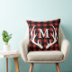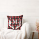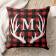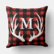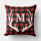 Obtenha que rústico e estilo morno do alojamento ou da cabine em sua caverna do homem ou toda a sala com este travesseiro decorativo surpreendente. Tem um design preto e vermelho da xadrez do estilo do búfalo com os antlers design de um cervo do branco e a letra do monograma. O travesseiro está o mesmo em ambos os lados.
