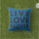 Denim Blue Colorway. Live, Love e Aloha é a mensagem neste travesseiro projetado que se reverte para uma versão positiva do padrão de Palma de Zebra nas costas. Estas folhas de palma gráficas simples foram inspiradas pelas palmeiras balneares. As suas listras simples lembram-nos dos padrões de uma zebra. Dois padrões coloridos como estes eram usados com frequência nos padrões antigos das camisas Aloha e Muu-Muus. Isso se coordena com outros produtos de fornalha residencial e vem em várias formas de cores.