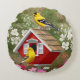 Uma cena lindamente pintada de potes americanos e uma brilhante casa de pássaros ricos, ao estilo da cabana vermelha, em um jardim florescendo com madeira e flores cosmos. Trabalho de arte realista criada de uma pintura do artista da vida selvagem Crista S. Forest.