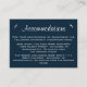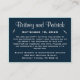Cartões de Alojamento/Recepção de Casamentos Azuis e Brancos de Marinho Náutico— apresenta um fundo azul marinho com várias fontes elegantes no topo e silhuetas brancas de gaivotas. Informe seus convidados sobre qualquer informação especial sobre o casamento e os alojamentos de hotel próximos para simplificar suas viagens ao seu grande dia. Simplesmente deslize essas placas com os convites e as placas RSVP correspondentes. As placas de recepção têm um design de burlap impresso. Encontre os produtos correspondentes abaixo nesta página. O estoque de cartão está definido como branco; no entanto, você pode mudar o estoque para creme, linho, metal, casca de ovo sob a opção 2). (abaixo do recurso personalizar).