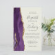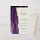 A borda esquerda deste elegante convite de casamento moderno apresenta uma cor d'água roxa, borda agitada, aparada com falso brilho dourado. O texto personalizável combina a escrita manual de cinzas de carvão, as fontes em copperplate e itálico em um fundo de marfim. O verso apresenta um design de agate roxo e dourado correspondente.