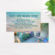 Cartão de visita com o tema da praia com modelo fotográfico atrás. Use esta carta tropical para alugar um condomínio de férias, uma casa de praia ou um quarto além do mar. Título texto e parágrafo de texto impresso, preto para informação de condomínio, sobre uma bonito imagem de água do oceano tropical e areia da praia. Inclua uma imagem pessoal no verso ou elimine a imagem para um verso branco simples.