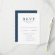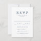 Nossos cartões de resposta ao casamento "Amado" de chico apresentam um marinho clássico e uma paleta de cores brancas que é perfeita para casamentos em qualquer época do ano. O reverso das elegantes cartas RSVP de casamento apresenta um design de padrão tradicional ligado. Personalize os cartões de resposta do casamento de na moda com seus detalhes de casamento personalizados e opções de janto!