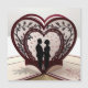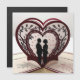Esta design retrata uma cena romântica e bela de um casal parado debaixo de uma árvore com galhos interligados em forma de coração. A árvore é decorada com folhas intricadamente detalhadas e pequenos pássaros poleirados nos galhos, acrescentando um toque de vida e calor à cena. Pequenos corações caem no fundo, melhorando a atmosfera romântica e adicionando profundidade visual à design. O quadro de ornamentado em torno do design aumenta seu apelo e o torna perfeito para um cartão de casamento que expressa o amor e a ternura entre o casal. Esta design é perfeita para ser usada como um convite de casamento ou um cartão de saudação romântico para qualquer ocasião especial