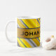 As características deste design da caneca um teste padrão das listras coloriram várias máscaras das cores como o amarelo e as cinzas. Igualmente caracteriza um nome feito sob encomenda dentro de uma área colorida ouro do falso.