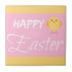 Um pintinho amarelo giro, em fundo rosa, com a saudação de "Felz pascoa" e uma borda amarela personalizada.