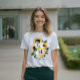 Camiseta elegante de girassol, estilo país. Nossa design apresenta nossos ouros pintados manualmente, girassóis amarelos, florais brancos e verde natural, arranjados para criar este elegante arranjo de país. Personalize com seu nome de formando e ano escolar. O verso apresenta os nossos girassóis amarelos de cor aquosa desenhados à mão juntamente com o ano. Todas as flores são obras de arte originais pintadas à mão e desenhadas pela Paparia de Moodthologia.