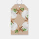 Morte de areia por dólar de Natal para amarrar presentes. As estrelas do mar castanho e os dólares de areia branca são combinados com um holly verde para criar um design de borda da coroa. Um painel branco central contém os textos "para" e "de" em script manuscrito. O texto na parte de trás é "Feliz Natal" ou você pode mudá-lo. As cores são bronzeadas, brancas e verdes com a escolha do fio para amarrar.