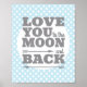 Negrito e gráfico com padrões e bolinhas em azul-bebê, branco e cinza, este divertido decoro na parede do berçário apresenta a citação popular, "Ame-te à lua e às costas" e é acentuado com duas setas de cinza bonitinhas.