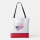 Este saco de tota de meio na moda é mostrado em Branco com texto lendo "América" acima de um sinalizador americano em um ângulo. Tem tira inferior de vermelho com fita fina azul real/Marinho. Personalize este item e altere o texto para o seu título, nome ou frase favorita.