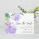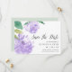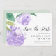 Os cartões salve a data florais elegantes apresentam peônias de aquarela em púrpura lavanda chica, acentuadas com verde-luxuoso. Personalize com seus nomes, data de casamento, local e site de casamento ou informações de convite, abaixo de "salvar a data" em script de caligrafia. Cartões à volta de verde pastel sólido.
