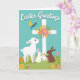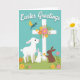 Concebido com um fundo suave em tom de azul turquesa, este cartão de Páscoa centra-se numa forma alta e branca decorada com aglomerados de flores cor-de-rosa, amarelas e laranja aninhadas entre folhas verdes frescas. Um primeiro plano relvado salpicado com minúsculas flores silvestres cria uma cena suave de primavera onde a amizade se sente próxima e fácil 🌷. À esquerda, um animal branco e felpudo permanece calmamente, sua postura relaxada como uma acompanhante silenciosa do momento. Perto dele, dois coelhos fofos de orelhas compridas compartilham um terno momento 🐰, com o menor, de pelo claro, oferecendo uma flor amarela ao seu companheiro mais escuro. Acima deles, um pequeno pássaro voa pelo ar, suas penas da cauda douradas capturando a luz enquanto ele cruza o céu. Uma saudação sazonal aparece perto do topo em letras fluídas, num tom mais escuro que se destaca claramente contra o azul turquesa. Os aglomerados florais envolvem o centro branco, com