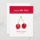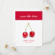 Anuncie o seu casamento de junho com este adorável cartão de Salvar a data com duas cerejas vermelhas com caules conectados.