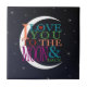 Frase colorida, "Amo-te à lua e às costas" com as estrelas noturnas e o céu atrás de uma lua parcial. Concebido por Robin; determinados elementos através da associação com a Fábrica de Gráficos