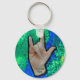 A seda pintada à mão é o fundo para esta design de chaveiro com o sinal de mão "I Love You" da linguagem de sinais americana.