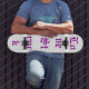 Um conselho branco do skate com amor golpeou escrito nele no roxo. Pelo amor © golpeado