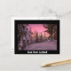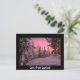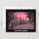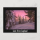 Cartão postal com um céu cor-de-rosa durante um pôr do sol sobre árvores de abeto cobertas de neve em uma floresta em Lapland no inverno com uma fronteira negra e o texto: "Amor da Lapónia".