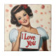 Uma ilustração vibrante no estilo pino-up clássico dos anos 1950. A imagem apresenta uma mulher glamourosa com curvas vintages, maquiagem ousada e um sorriso radiante. Ela segura uma placa com uma mensagem amorosa, "Eu te amo", colocada contra um pano de fundo de delicadas rosas rosa. A estética geral captura a vibração romântica e brincalhona da arte "pin-up" do século do médio.