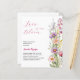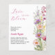 Um fundo branco chic. Decorado com flores silvestres em rosa, roxo, amarelo. Personalize e adicione o nome da noiva a ser e os detalhes da festa. Texto: O amor está florescendo. 1 folha = 1 convite impresso de borda a borda.