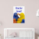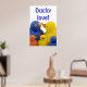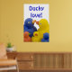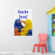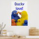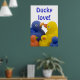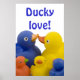 Dois patos de borracha apaixonados. Um poster bonitinho com um beijo de patos azuis e amarelos. Três pequenos patos com seu pai e múmia celebrando sua família feliz ou talvez um novo bebê. Poster que você pode personalizar com sua própria mensagem de texto. Perfeito para aquele que você ama celebrar seu aniversário, gravidez ou novo bebê ou bebês.