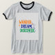 Esta design de camiseta apresenta a frase "Wander. Sonho. Descubra." em uma fonte desenhada à mão, de várias cores. Cada palavra é uma cor distinta — laranja, azul e verde — e é acompanhada por um pequeno elemento gráfico, como uma bússola, uma nuvem e uma estrela. O design tem um pouco de vintage, perfeito para qualquer um que ama viagem e explorar.