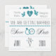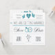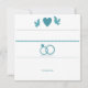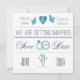 Um anúncio esbranquiçado e teal com corações, pombas, anéis de casamento e uma mensagem "Salvar a Data".
