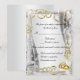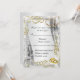 Lindo com redemoinhos dourados, detalhes com diamantes e alianças de casamento. Este lindo cartão de RSVP/resposta de casamento está pronto para ser personalizado para o seu dia especial de casamento. Personalize o cartão alterando o texto nos campos fornecidos na frente e no verso. Você pode alterar o estilo da fonte, tamanho e cor, bem como o tipo e estilo de papel.