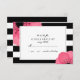 Um convite simples e moderno da r.s.v.p. do casamento, com uma ilustração de anêmonas rosa-quente sobre um fundo listrado preto e branco.