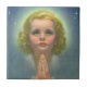 Ilustração Vintage de design religioso do Cristianismo apresentando um retrato de uma jovem loira em oração. Ela parece um belo anjo com halo ou aura e está cercada por estrelas no céu.