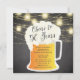 Anima-se com o convite de 50 anos de aniversário com uma caneca de cerveja colocada sobre fundo de chalkoard com luzes de jarro de pedras suspensas