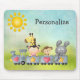 Mousepad colorido bonito/mousemat com uma ilustração lunática adorável do vetor dos desenhos animados de um girafa bonito, do macaco, do elefante e de uma menina em um trem bonito com corações e estrelas em um fundo do verão da grama verde e do céu azul com um sol amarelo bonito. As mulheres, os miúdos e as meninas de todas as idades amarão estes animais felizes do divertimento!
