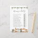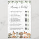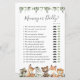 Cartão de jogo de chá de bebê temático de animais da floresta apresenta uma ilustração de animais da floresta em aquarela e guirlanda de eucalipto verde-aquarela e fonte elegante em estilo manuscrito.