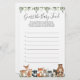Animais da floresta com o tema chá de fraldas adivinhação do bebê comida o cartão de jogo apresenta uma ilustração de animais safari com aquarela e verde-aquarela eucalyptus garland e uma elegante letra de estilo manuscrito.