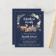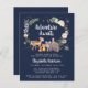 Chá de fraldas de inverno rústico, bonito e econômico, com ilustrações em aquarelas de animais de floresta, florais, estrelas verdes e douradas e flocos de neve. "Aguardam" e o nome da futura mãe é escrito em um roteiro branco contra um fundo azul escuro.