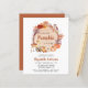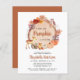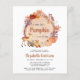 Convite orçamental russo, com temas de outono, neutro em termos de gênero, que inclui uma coroa aquática composta por um tronco de árvore, animais de floresta fofos (coruja, veado, esquilo e raposa), flores de queda e abóboras. Um "Docinho Pumpkin Está a Caminho" é escrito numa mistura de simples tipografia e uma escrita de terracota.