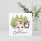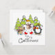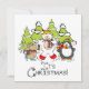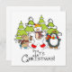 Um cartão de design de Natal bonito e colorido com um urso polar, pinguim e rato, todos com lenços e skates de gelo com árvores cobertas de neve e texto que diz É Natal!