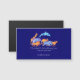 Um cartão de visita magnético com uma imagem de aquarela digital de um rebanho de animais selvagens a correr juntos. Os animais incluem golfinhos saltadores, girafa, elefante, canguru, rinoceronte, leão e leopardo. Colocado sobre um fundo roxo azulado.
